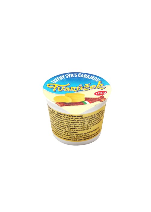 Olomoucké tvarůžky 47%, voda, přírodní sýry, čabajka 9% (107g na 100g hotového výrobku, vepř. maso, vepř. slanina, vepř. kůže, sůl, koření a extrakty z koření, dextróza, látky zvýrazňující chuť: E621, E635, antioxidant: E300, barvivo: E120, vepř. bílkovina, regulátor kyselosti: E575, startovací kultura, konzervant: E250), tvaroh, sušená syrovátka, tavicí soli: E331, E451, konzervant: sorban